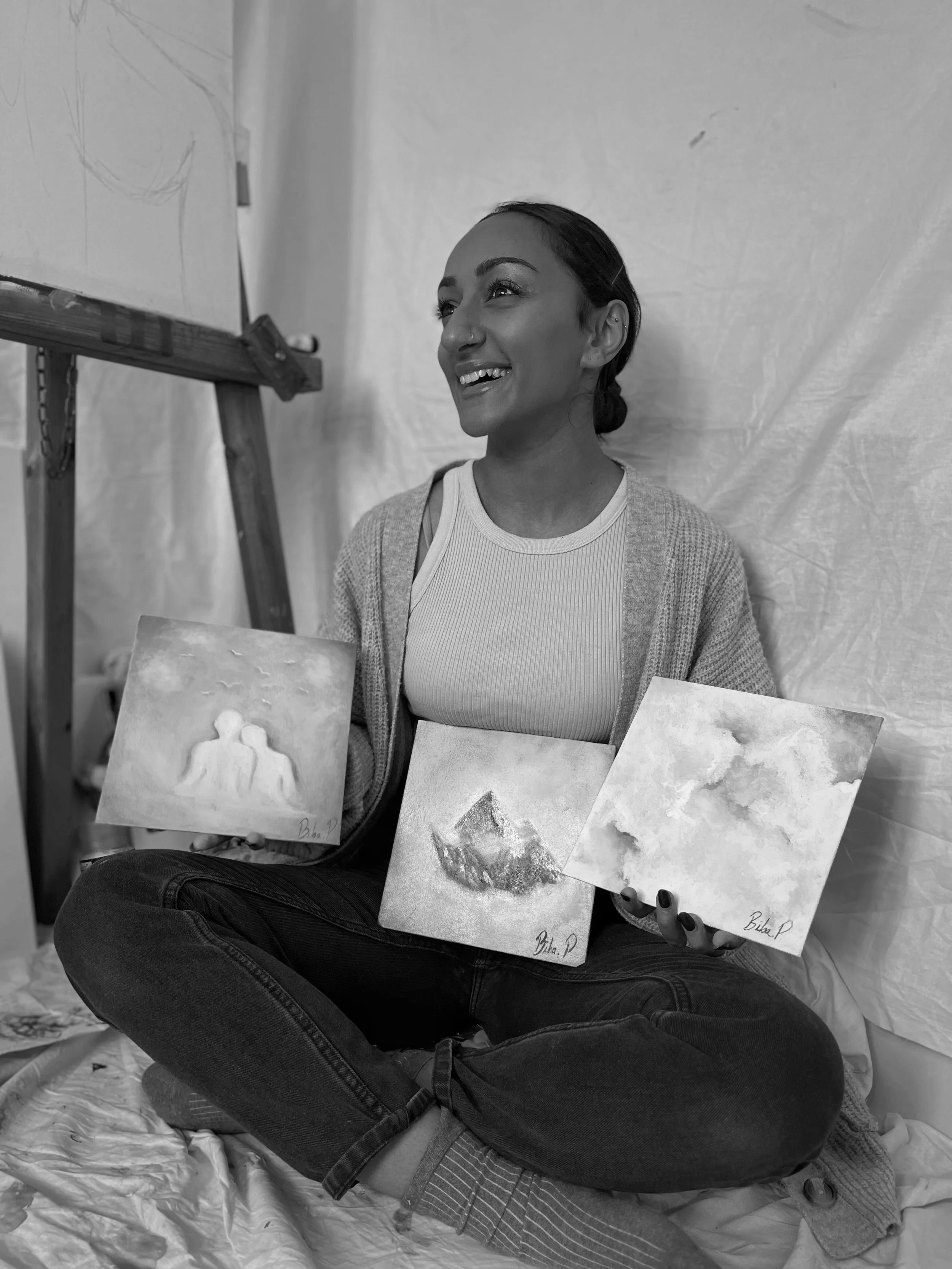 Starting in 2020, Biba continues to push through boundaries whilst having no previous art experience but instead utilising human connection to create pieces that the world can connect with. Whilst Biba is only at the beginning of her journey, she continues to work towards her goal of creating vibrant, expressionist work that bring life, and joy into everyday lives.